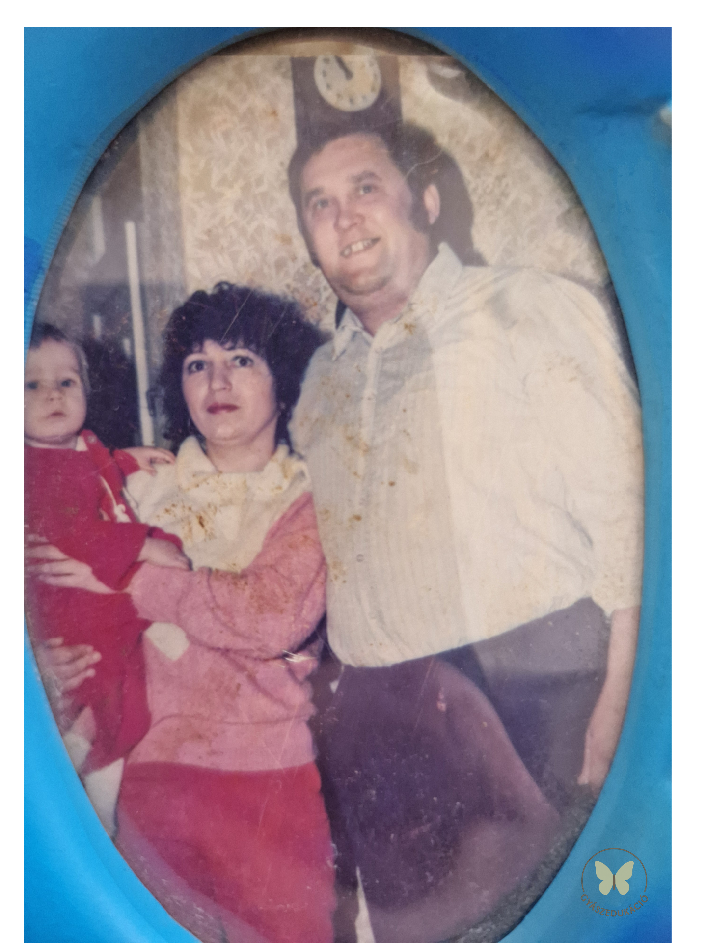 Van egy fénykép a nappaliban. Megsárgult, kopott, gyűrött.